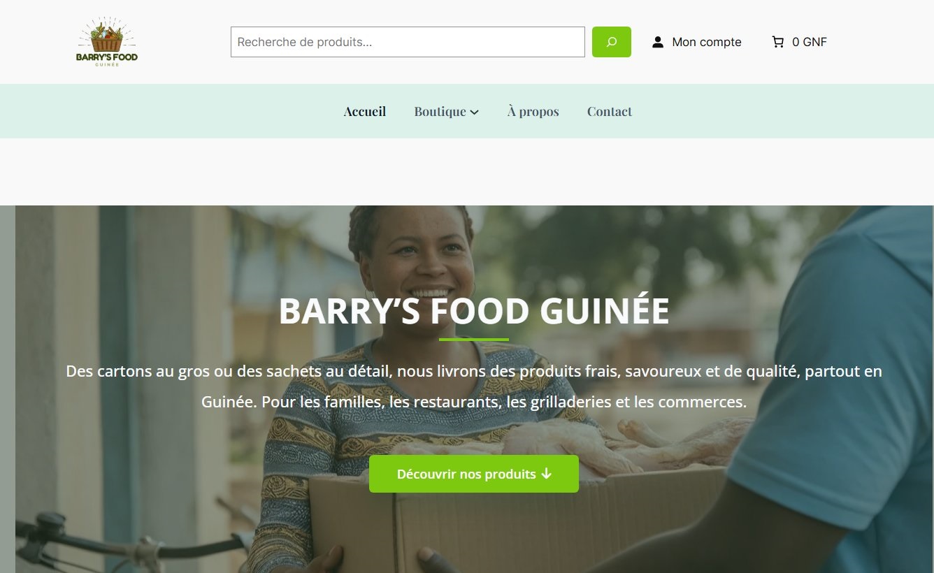 Site e-commerce pour la vente de produits agroalimentaires, mettant en valeur les produits, les services et l’identité de marque de Barry’s Food.