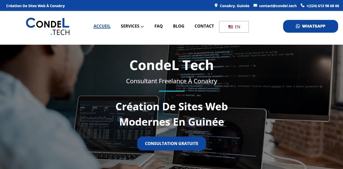 Site vitrine officiel de CondeL Tech présentant ses services numériques, son portfolio, ses offres commerciales et son blog autour du numérique en Guinée.