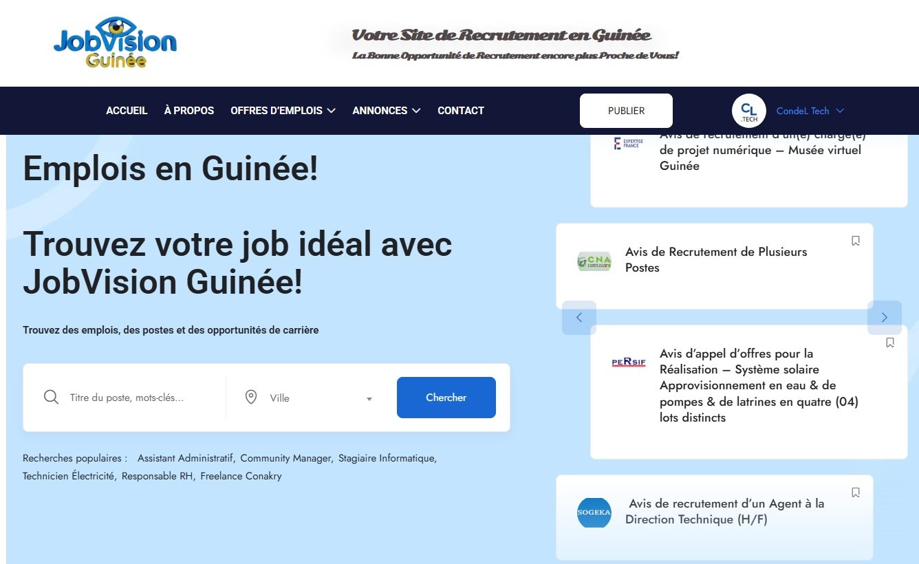 Plateforme dédiée à la recherche d’emploi en Guinée, avec publication d’offres, gestion des candidatures et mise en relation recruteurs-candidats.